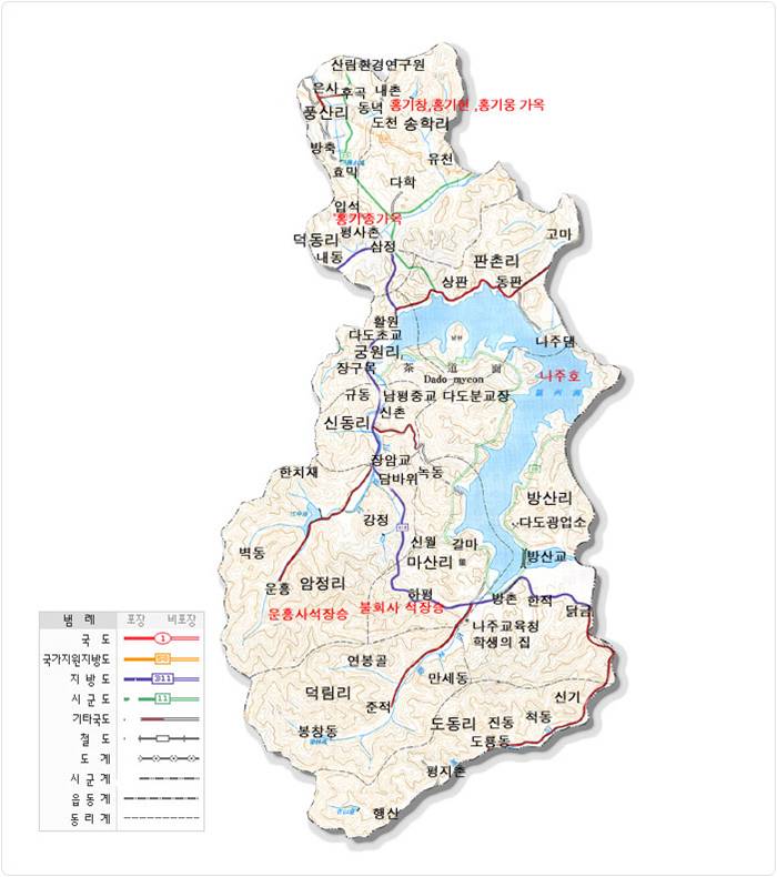 기본현황 행정구역 : 11개리 25운영마을 43개반 가구 : 1,108세대. 인구 : 2,199명 (남 1,114, 여 1,085) 면적 : 7,314ha 관광지 : 나주호, 중흥골드스파, 불회사, 벚꽃길 등 위치 및 자연환경 나주시청에서 동서쪽으로 24km떨어진 지점에 위치 화순군 도암면과 경계, 산포면과 봉황면에 접하고 있음 남부에는 국사봉이 솟아 있고, 기타지역은 산지로 그다지 높지 않으나, 면 전체는 남고북저의 지형임. 영산강의 지류인 대초천 상류에 나주호가 있음