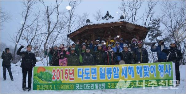 다도면 지역발전협의회를 비롯한 사회단체에서는 을미년 1월 1일 새해를 맞아, 임방규 다도면장, 지역발전협의회(회장 최종안), 임동연 주민자치위원장, 각 마을 이장단(단장 김용두), 온누리 산악회(회장 임춘자), 다도부녀회 회원, 재광 향우회 회원 등 지역주민 200여명이 참석한 가운데 ‘2015 다도면 일봉암 해맞이 행사’를 가졌다.