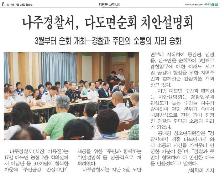 나주경찰서는 2010년 12월 29일 주민 치안만족도 향상을 제고하기 위해 다도파출소 개소식을 가졌다. 다도파출소는 봉황파출소 소속 다도치안센터로 이 지역 치안을 담당해 오던 중 주민들의 파출소 부활 민원과 지역주민들과 함께 호응하고 공감할 수 있도록 한발 다가가는 양질의 치안서비스를 제공하기 위해 개소하게 된 것이다.