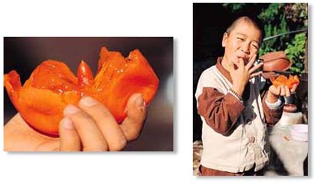 암정리의 명물은 뮈니뭐니 해도 속감이다. 속감은 속살 안에 또 하나의 감을 품고 있는 감이다. 감을 먹다 보면 안에서 껍질로 둘러싸인 감이 또 하나 나와서 사람을 당황케 한다. 어쩌다 한두 개의 열매가 그런다면 돌연변이종이라고 생각할 수도 있겠으나 해마다 열리는 감나무의 열매 모두가 그렇다.