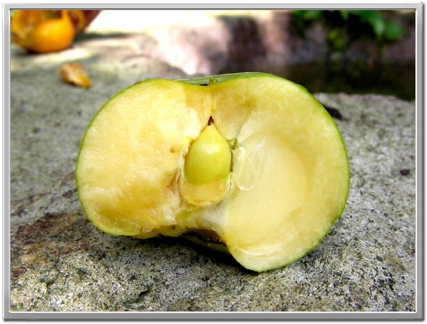 높이는 6-14m이고 줄기의 겉껍질은 비늘 모양으로 갈라지며 작은가지에 갈색 털이 있다. 잎은 어긋나고 혁질이며 타원상 난형이다. 잎은 길이 7-17cm, 너비 4-10cm로서 톱니는 없고, 잎자루는 길이 5-13mm로서 털이 있다. 꽃은 양성 또는 단성으로 5-6월에 황백색으로 잎겨드랑이에 달린다. 수꽃은 16개의 수술이 있으나 양성화에는 4-16개의 수술이 있다. 암꽃의 암술은 길이 15-18mm이고 암술대에 털이 있으며 길게 갈라지고 씨방은 8실이다. 열매는 난원형 또는 편구형이고 10월에 황홍색으로 익는다.