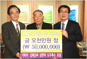 김 옹은 “자녀들이 이번에도 나의 뜻을 흔쾌히 동의해 주어 평생 사회에 봉사하는 일을 하게 되어 매우 기쁘다”면서 “적은 돈이지만 이것이 밑거름이 되어 나주에 많은 인재들이 배출되었으면 하는 마음에서 기탁하게 되었다”는 뜻을 전했다.