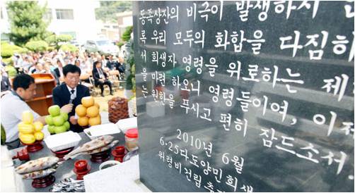 용서와 화해의 물꼬는 5년 전 지역 유지들이 텄다. 이들은 “이제 와서 좌우가 무슨 소용이냐”며 불행했던 과거사를 털고 가자고 유족들을 설득했다. 비극의 씨앗이 좌우익 대립에서 비롯됐다는 사실을 기록해 역사적인 교훈으로 삼자며 유족들과 함께 ‘양민학살 진상조사 추진위원회’를 꾸렸다.