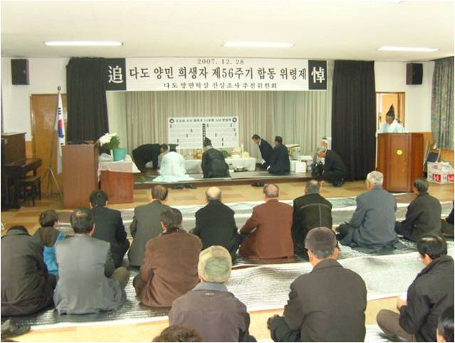 안병욱 진실화해위 위원장은 “다도면에서는 군·경이 젖먹이를 업은 부녀자를 사살하기도 했고, 빨치산이 우익인사들의 가족을 죽창으로 찔러 죽이기도 했다”며 “60년이 다된 시점에서 참상을 입에 올리는 것이 유족들한테 송구하고 부끄럽다”고 눈시울을 붉혔다. 강희락 경찰청장도 대독한 추도사에서 “비록 전쟁 시기였으나 국민의 생명과 재산을 보호해야 할 공권력이 참상을 빚은 것을 유감으로 생각한다”고 사과했다.