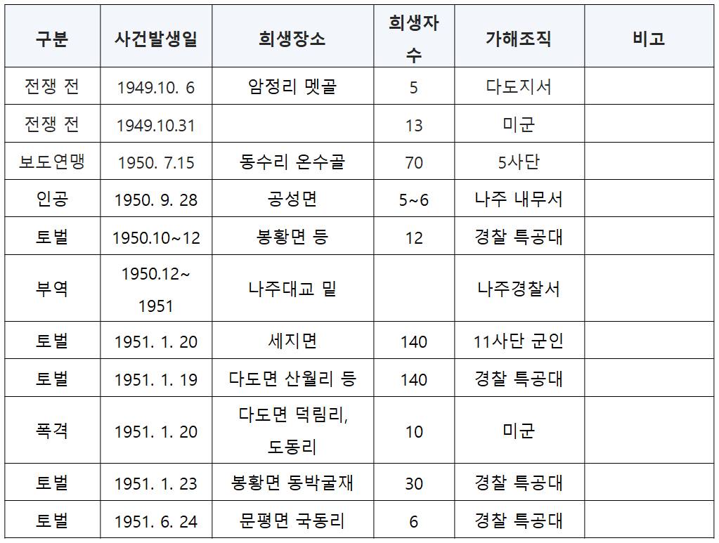 1951년 3월 19일에는 나주군 다도면 도동리 척동마을과 신기마을 주민들이 군의 빨치산 토벌과정에서 죄 없이 학살되었다. 그밖에도 여러 곳에서 경찰에 의해 토벌과정에서 많은 사람들이 희생되었다.