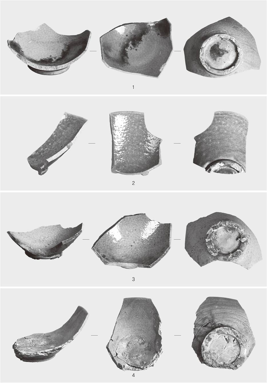 3 청자완 편 굽과 몸체가 남아있다. 몸체는 사선으로 벌어지며, 상단부로 갈수록 기벽의 두께가 얇아진다. 내저면은 완만한 곡면을 이룬다. 굽은 낮게 직립하며, 접지면의 폭이 비교적 넓은 편이다. 접지면에는 2개의 내화토받침흔이 남아있다. 태토는 고운 점토이며, 옅은 담녹색을 띠는 유약이 전체적으로 시유되었다. 번조과정에서 생긴 기포로 인해 표면이 고르지 않다. 잔존 높이 4㎝, 두께 0.4~0.9㎝, 굽 지름 5.4㎝, 굽 높이 0.6㎝, 굽 접지면 폭 1.1㎝