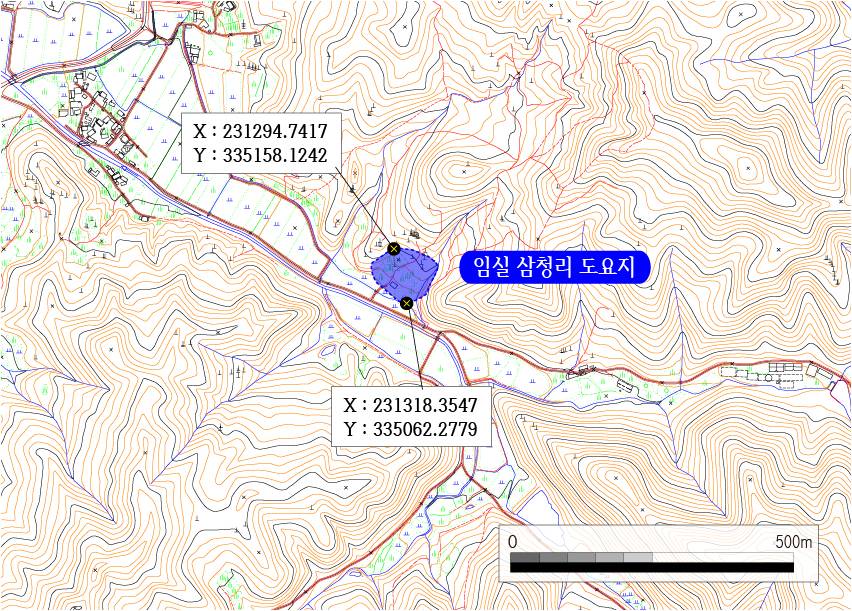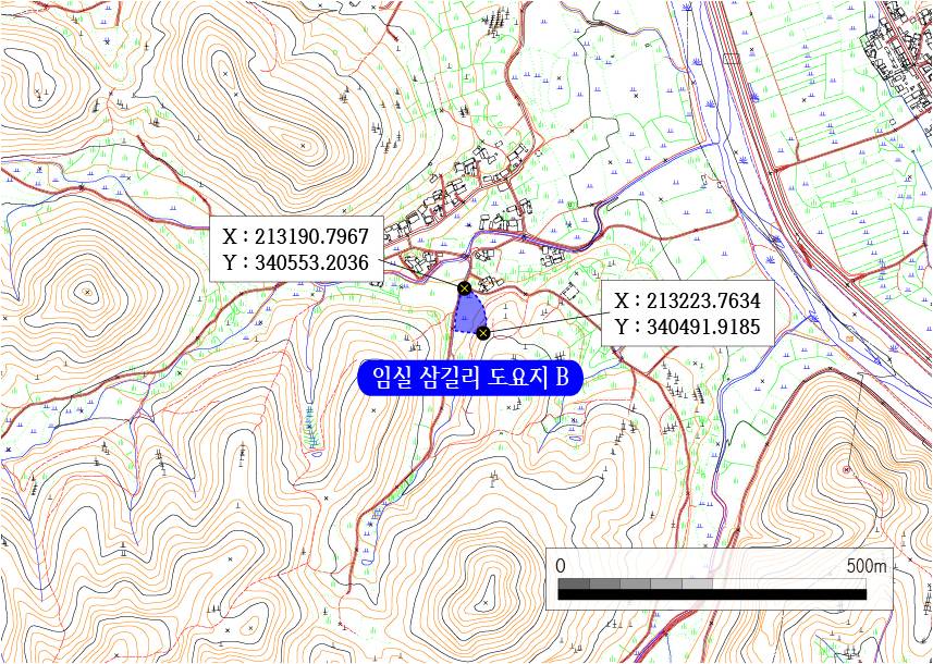 소재지 : 성수면 삼청리 83 유적의 현황 : 성수면 삼청리 구곡마을 동쪽에 삼청리 도요지가 자리하고 있다. 이 마을에서 동쪽으로 600m 가량 떨어진 곳에 창원 정씨 재실인 雲東齋가 있는데, 이 재실 뒤편에 삼청리 도요지가 있다. 백제 한성기 백제와 가야를 최단거리로 이어주던 간선교통로가 통과하던 곳으로 동쪽에 한치재가 있다. 성수면 동남쪽에 위치한 매봉(430m)에서 서북쪽으로 뻗은 산자락의 남쪽 기슭 하단부로 비교적 완만한 지형을 이룬다. 이 일대는 재실을 중심으로 대부분 계단식 논과 밭으로 개간되었으며, 재실의 서쪽은 대규모 민묘 구역으로 조성되었다. 재실 뒤편 밭에 도요지가 자리하고 있는데, 오래전 밭 개간과 경작 활동으로 흙이 유실되어 가마의 벽체가 지표면에 노출되어 있다. 그리고 밭과 민묘 구역 경계에도 또 다른 가마가 더 자리하고 있을 것으로 추정된다. 재실 뒤편 밭둑에는 훼손된 가마의 벽체편과 백자편, 소토가 서로 섞인 상태로 상당량 쌓여있으며, 현지조사 때 수습된 백자편은 조선 후기로 추정된다.