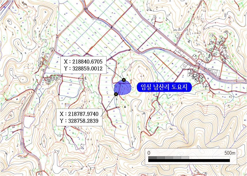 소재지 : 청웅면 남산리 570 유적의 현황 : 청웅면 남산리 남산마을 서쪽 안골에 남산리 도요지가 자리하고 있다. 남산마을에서 서쪽으로 400m 가량 떨어진 남북방향으로 뻗은 산자락 서쪽 기슭 하단부가 여기에 해당된다. 이 일대는 대부분 밭으로 개간되었는데, 임실 남산리 도요지가 자리하고 있는 곳은 밭 사이로 임야지대를 이룬다. 현지조사 때 가마처럼 약간 볼록하게 솟은 곳에서 불 먹은 소토와 조선 후기의 백자편이 다량으로 확인되어, 도요지의 보존상태가 양호할 것으로 추정된다. 수습유물 : 현지조사 때 백자와 도지미가 채집되었는데, 백자는 대접과 접시, 완 등이 섞여있다. 유약의 색깔은 회백색·황갈색·회색·짙은 회색 등으로 다양하며, 전면에 두텁게 시유된 유약은 거의 빙렬이 보이지 않는다. 굽은 투박한 다리 굽과 굽바닥이 약간 내경된 다리굽이 섞여있으며, 굽의 높이는 1cm를 넘지 않는다. 소성방법은 대부분 포개어 소성하였는데, 받침은 가는 규사와 굵은 규사가 섞여있다. 제작수법은 유약이 시유되지 않은 부분이 있을 정도로 조잡하며, 요도 구는 바닥면이 편평한 원통형 도지미가 대부분을 차지한다. 백자와 도지미의 속성에 의하면 도요지는 19세기 늦은 시기부터 20세기 이른 시기까지 운영된 것으로 추정된다.