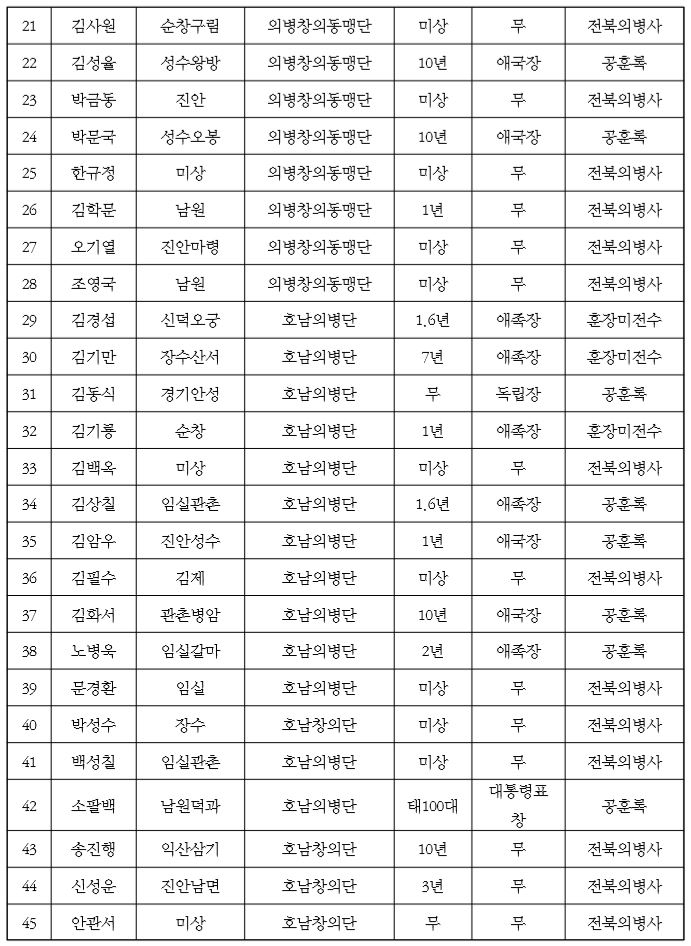 성상(聖上) 45년 무신년(1908) 4월 28일 패군장 이석용은 3척의 제단을 베풀어 제물을 차리고 피눈물로 축문을 지어 통곡하니 용담의 전망戰亡 의장 박만화·의동 박철규와 허천석·순창의 전망의졸 최일권·두봉의 전망의사 이광삼·남원의 전망 의사 김사범과 의졸 서상렬·장수의 전망의사 허윤조와 의졸 성경삼과 의졸 양경 삼, 췌리의 피화被禍 의졸 오병선·운현의 전망의장 최덕일과 여주목·의사 한사 국·의졸 윤정오·한득주·김춘화·정 군삼·박운서·김치삼·박인완·김여집· 서성일·박달천·의동 김동관·김학도·의승 봉수·덕흥의 소靈所에 결별을 고하 나이다.2)