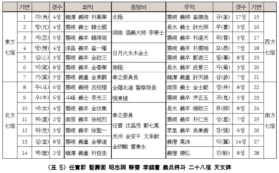 이상과 같이 천문의 요체를 표상하는 28수 별자리에 그렇다면 어떤 기준으로 각 의병들을 각각 배당하 는가 하는 문제를 점검할 필요가 있겠다. 비석을 자세히 살펴보면 각 4방 칠수가 시작되는 처음에 의장義將을 내세웠고 그 다음에 의사義士 를 그 다음에 의졸義卒을 마지막으로 의동義童 혹은 의승義僧을 내세운 것을 알 수 있다. 곧 의병장 이석용 휘하에 활약하 던 의병들을 사방위로 나눈 다음 각 계급 별로 서열화시키고 있는 것이다.