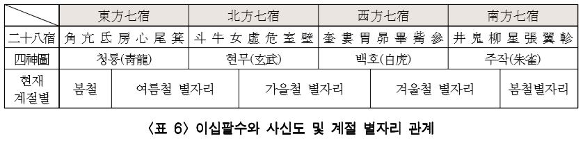 이렇게 공간과 시간상으로 조금 다른 듯하지만 천체의 공간적 관점에서 조망하면 시간과 공간 곧 사계절과 사방위를 일치시키기 위해서는 불가피한 장치 음을 이해하게 된다. 28수 별자리와 사신도가 서로 결합되면서 비로소 28수 별자리가 천상과 지상의 시공간을 연결짓는 중요한 천문 원리로 운 되기에 이르 다. 이로 부터 전통적인 동양의 천문학과 천문사상에서는 북극성과 적도 28수 별자리가 천 문의 모든 것을 변하는 요체로 인식되었던 것이다.