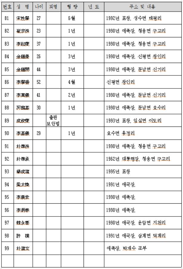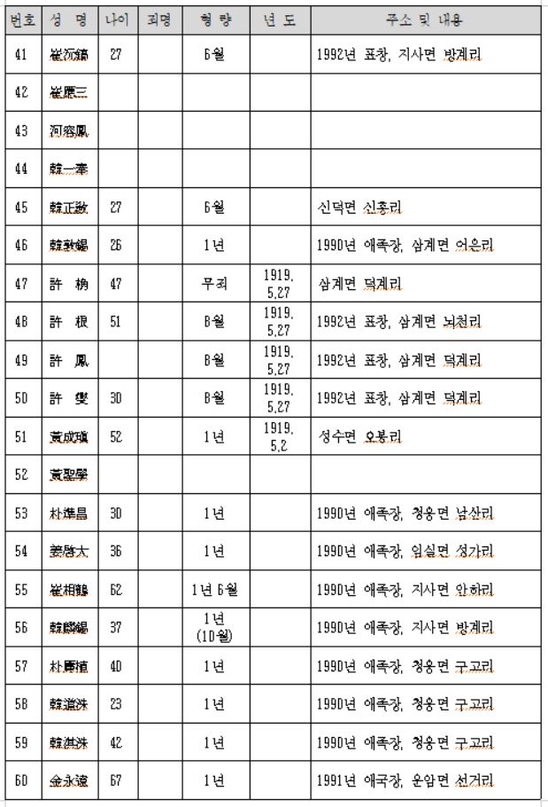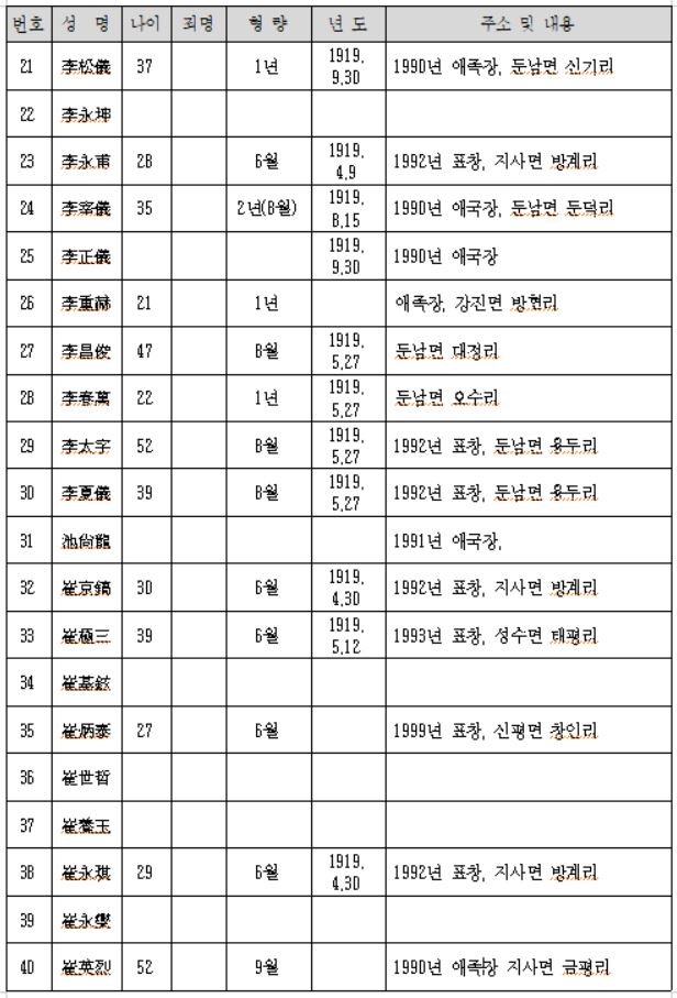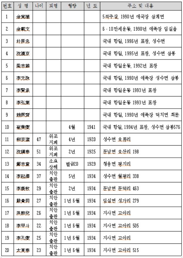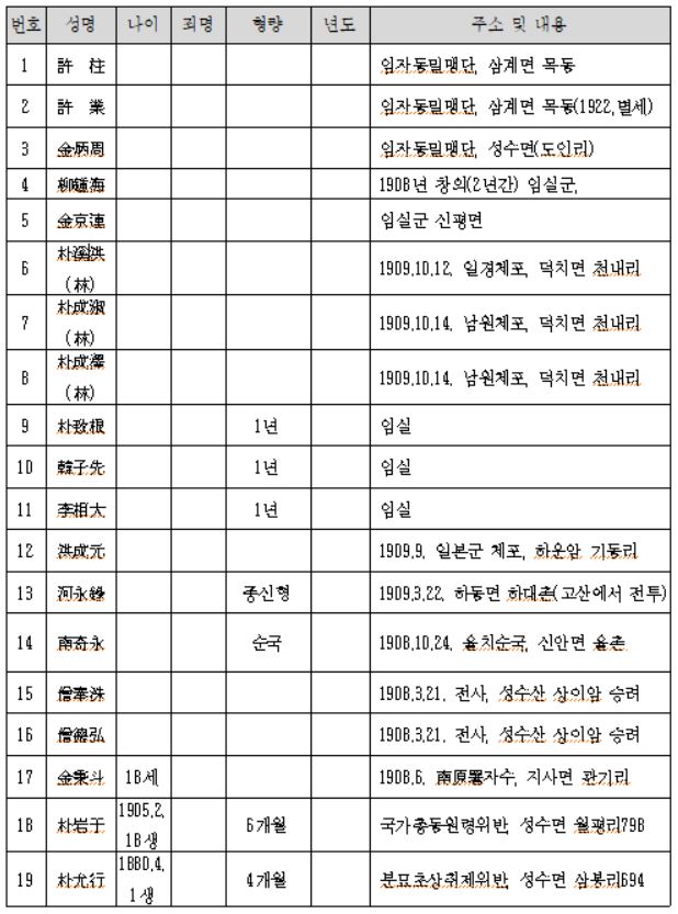 註 1. 본 자료는 한국독립동지회 전북지부에서 제공한 자료임. 2. 빈 란은 조사가 되지 않은 사항이나 본문에는 자세하게 기록된 경우도 있음. 3. 본 자료와 본문 내용과는 차이가 있을 수도 있으며 본문 내용에 없는 분도 있음.