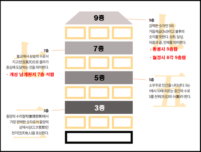 탑의 층이 홀수인 이유는 수직적인 의미에서 홀수가 영원한 생명의 수를 뜻하기 때문입니다. 반면 수평적인 각, 기단에 적용되는 수는 짝수입니다. 이것이 탑에서 나타나는 홀수와 짝수의 원칙입니다.