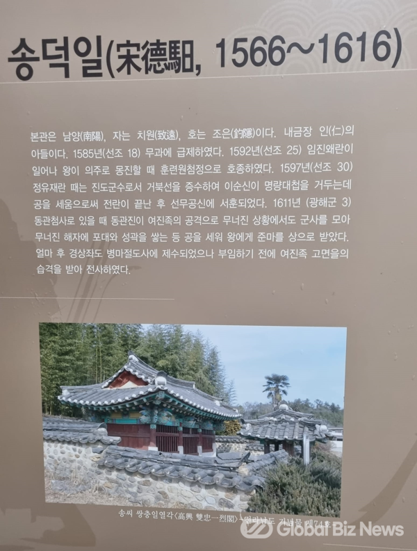 무신 송덕일은 정유재란 때 진도군수로서 거북선을 중수하여 이순신 장군이 명량대첩을 거두는데 크게 공을 세워 선무공신에 서훈되었다. 전남 고흥군 대서면 서호 1길에 宋氏 雙忠一㤠閣(전남 기념물 제74호)이 있다. 정유재란 시기 흥양(興陽, 현재 高興) 현감이었던 최희량(崔希亮, 1560~1651)의 《임란첩보서목》에는 고흥에서 판옥선 등 전선과 천자총통, 승자총통 등 화약 무기류를 직접 만들었다는 내용이 있다.