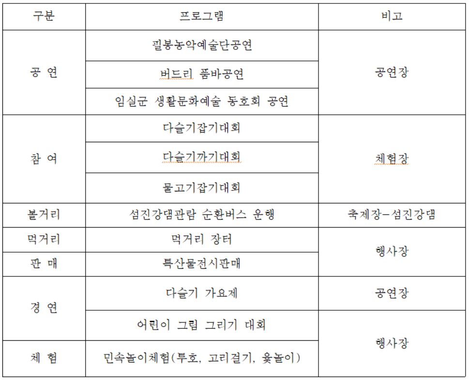 행사 프로그램으로는 임실필봉농악의 풍물놀이와 전통 민속놀이인 고리걸기, 투호놀이, 제기차기, 윷놀이 등을 마을별로 경기를 진행하고 그 외 주민들이 참여하는 노래자랑, 스포츠 댄스, 체육활동, 행운권 추첨 등을 통해 즐거운 하루를 보내는 행사이다. 더불어 매년 지역발전을 위해 헌신한 분에 대한 시상도 하며 공로상과 효열상등을 수여하고 있다.