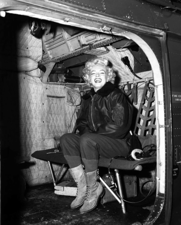 마릴린 먼로는 비행장에 운집한 병사들에게 반갑게 손짓하고는 바로 시코르스키(Sikorsky H-19 Chickasaw) 헬기로 갈아탔다. 헬기는 정원이 10명으로, 먼로는 처음에 어디로 가는지 몰랐다. 밝은 표정으로 웃으며 병사들과 대화했다. 할리우드 대스타를 모신 헬기는 미 해병 제1사단이 주둔한 연병장으로 날아가 부대 상공을 낮게 선회했다.