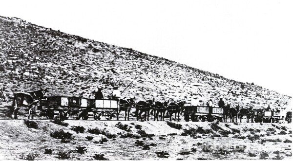 ▲ 남아프리카 구리광산 나마퀄랜드 철도 노새 열차(Namaqualand Railway mule train) 1876년(사진:위키피디아)