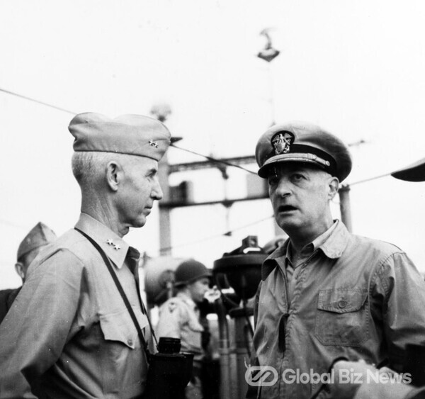 ▲ 해병대 1사단장 올리버 P. 스미스 소장과 제임스 H. 도일 소장(사진:미 국립기록물 보관소)