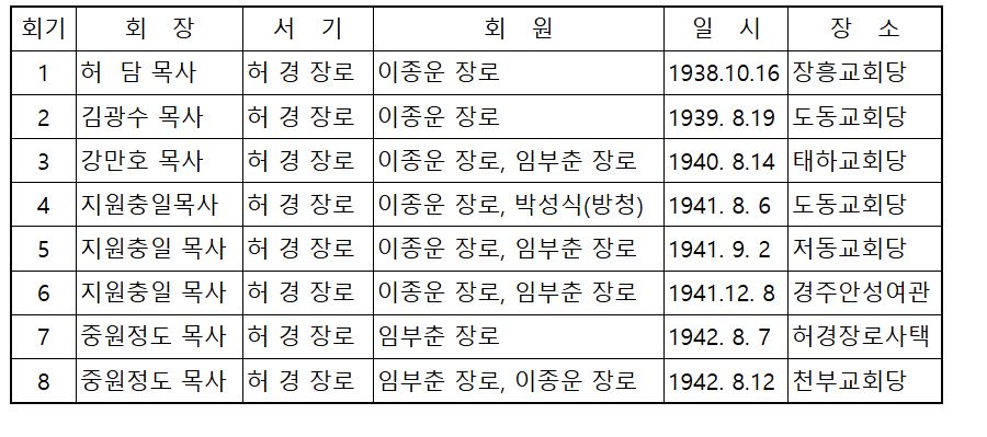 회장 목사 지원충일(정해규) 서기 장로 허경 회원 장로 이종운 방청 전도사 박성식