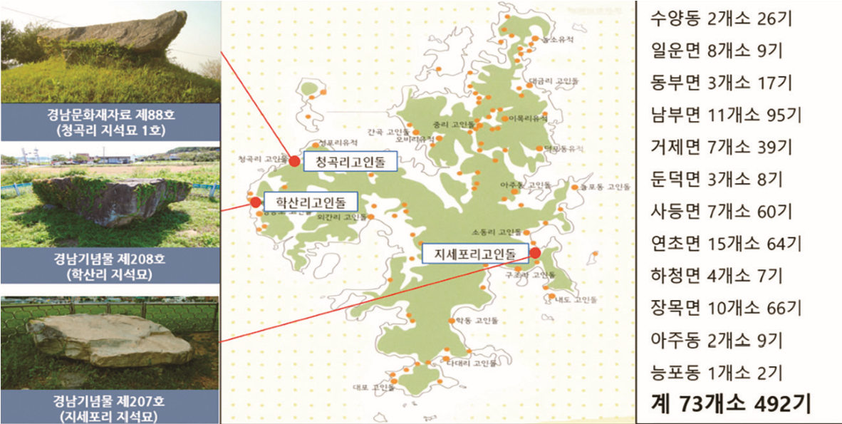 거제에는 청동기시대에 세력이 큰 부족이 많이 살았음을 고인돌 유적을 통해 확인할 수 있다. 2005년 거제시와 동아문화연구원에서 거제 전 지역 전수조사를 한 결과 거제의 해안가와 하천 주변 들판 등 73개소에 492개의 고인돌이 있었다.1) 그러나 1973년과 1974년 한화오션(구 대우조선)과 삼성중공업 등 국가조선산업단지가 조성되고 도시의 팽창과 주거환경 개선 등으로 인하여 이제는 찾아보기 힘든 실정이다. 그나마 사등 청곡리지석묘, 둔덕 학산리지석묘, 일운 지세 포리지석묘 3곳은 문화재로 등재되어 거제시에서 관리하고 있으나 그 외 지역은 거의 소멸되었거나 방치된 상태로 청동기시대의 문화 유산이 사라지고 있어 안타까운 실정이다.