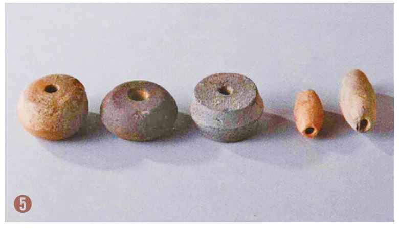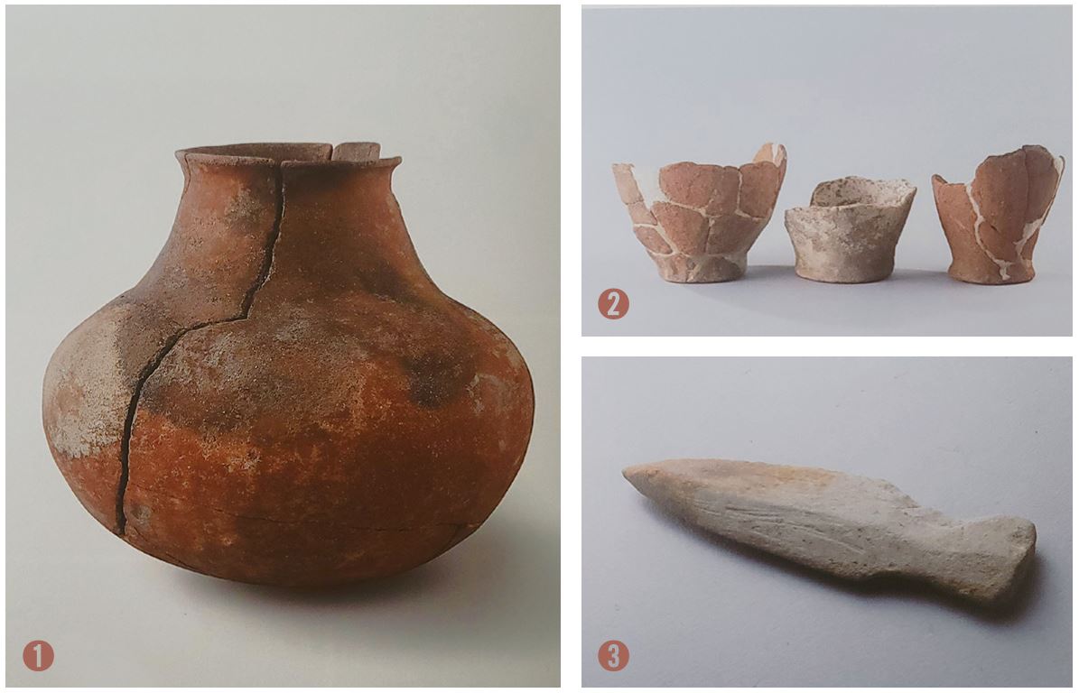 ① 붉은간토기(농소리 유적) ② 민무늬토기(덕포동 집터) ③ 돌칼(덕포동 유적 주거지) ④ 돌화살촉, 돌끌, 돌칼(아주동 지석묘) ⑤ 가락바퀴, 어망추(아주동 유적