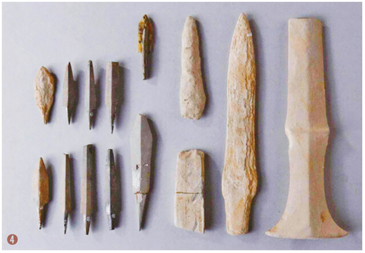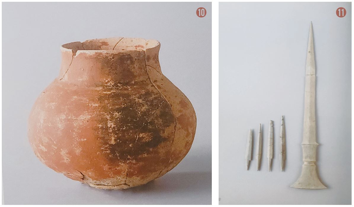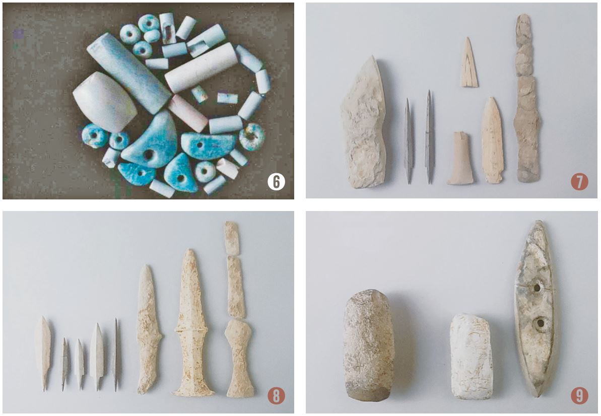 ⑥ 옥구슬(아주동 유적) ⑦ 홈자귀, 돌화살촉, 돌칼(대금리 유적) ⑧ 돌화살촉, 돌칼(오비리 유적) ⑨ 돌도끼, 반달돌칼(창호리 유적) ⑩ 붉은간토기(대금리 유적) ⑪ 돌화살촉, 돌칼(이목리 유적)