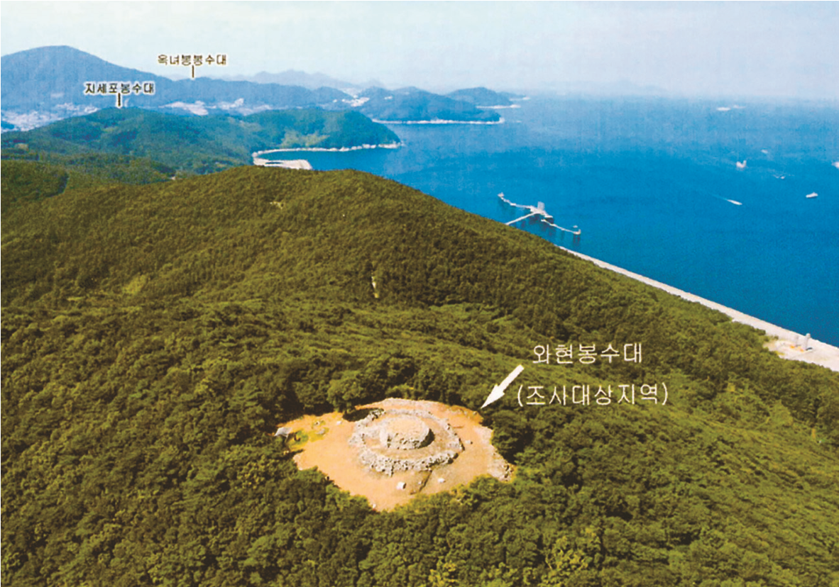 와현봉수대의 설치 시기는 명확하지 않다. 또 문헌 기록상 《대동지지》(1866)부터 나타난다. 하지만 강망산봉수대와 마찬가지로 출토 유물은 조선 전기의 것으로 측정된다.11) 아마도 세조 3년(1457) 지세포와 조라포 사이에 후망(候望)을 설치하고 본진의 군인들이 지키게 하자는 논의가 있었는데,12) 이때 수군진의 병사들이 바닷가를 경비하는 간이 봉수 형태로 처음 운영되었다가, 강망산 봉수대처럼 권설봉수로 증축된 것이 아닐까 싶다.