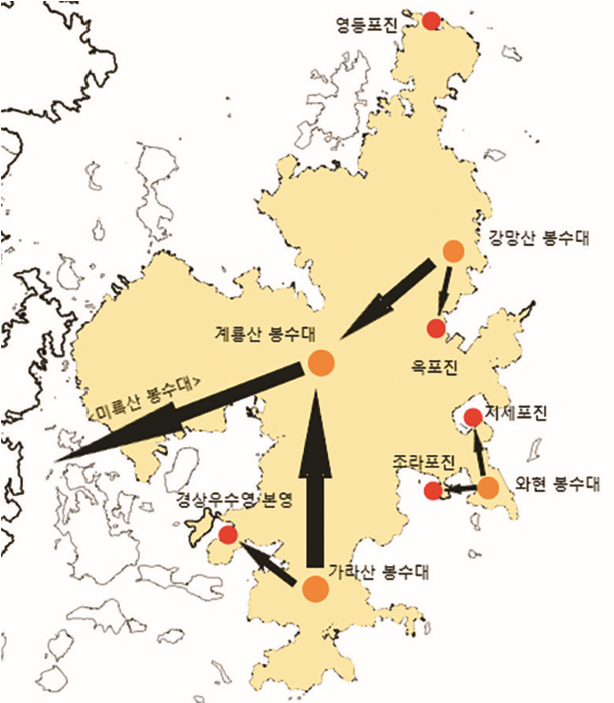 계룡산봉수대는 특이한 점이 많다. 왜선들이 출몰하는 바닷가가 아닌 거제도 한복판에 위치했다는 점과 가라산봉수대에서 미륵산봉수대로 보내던 신호를 대신 전달했다는 점이다.6) 동북 해안가 수군진과 봉수대에서 수집한 정보를 현령이 신속하게 받기 위해서는 새로운 봉수대가 필요했고, 이를 위해 계룡산봉수대가 15세기 들어 추가로 설치되었다고 이해할 수 있다. 다시 말하자면 계룡산봉수대는 넓은 거제도 해안선의 첩보를 통할(統轄)할 수 있는 최적지였던 것이다.