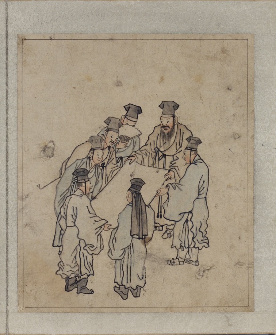 유생들이 세로로 긴 종이를 잡고 둘러서서 그림을 감상하는 장면을 그렸다. 구경하는 인물들의 표정이 매우 진지하며, 특히 침이 튈까봐 부채로 앞을 가린 유생의 모습이 인상적이다. 종이에 아무 것도 그려져 있지 않아 그들이 무엇을 보고 있는지 알 수 없지만, 그들의 열정을 느낄 수 있다.