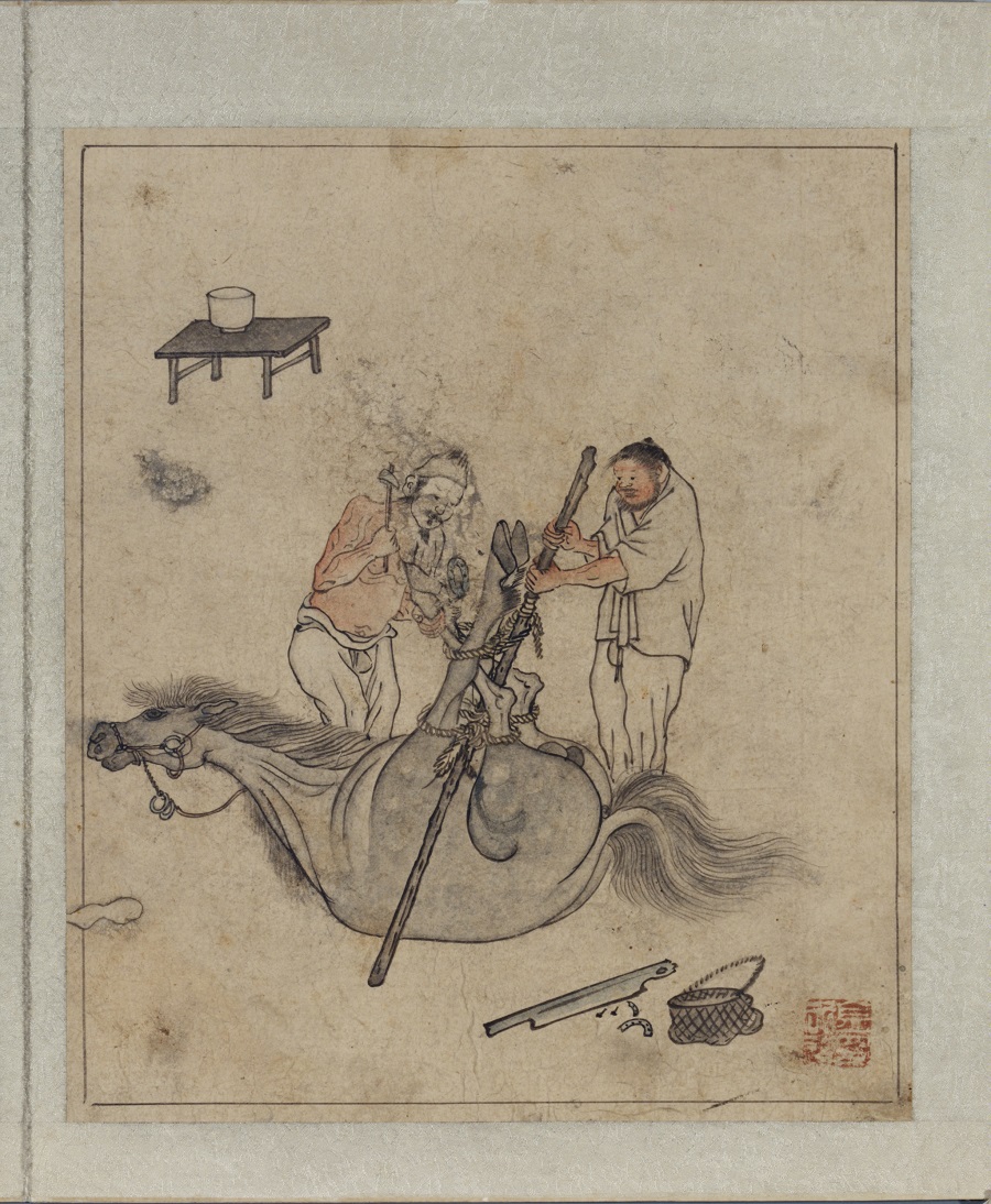 말을 눕힌 다음 네 다리를 나무에 묶어 요동치지 못하게 하고 편자를 박는 장면을 묘사한 것이다. 화면 왼쪽 위에는 땀 흘리는 두 사람의 목을 축여줄 물이 상 위에 놓여 있고, 아래에는 바구니와 공구가 배치되어 화면의 구도를 살리고 있다.