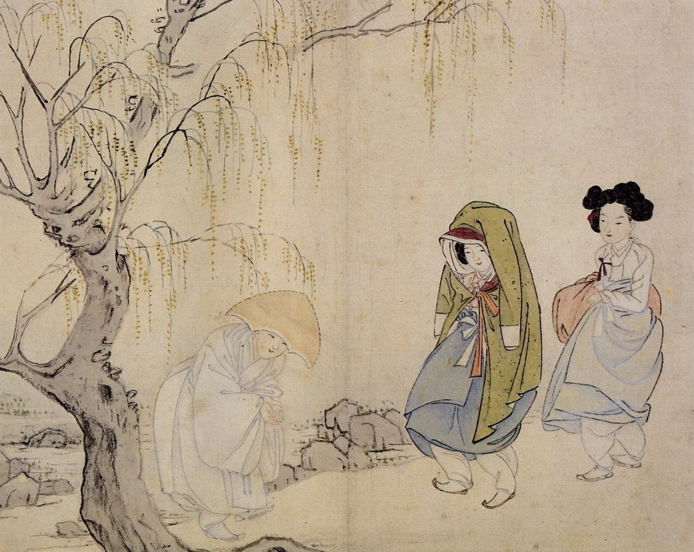 장옷은 원래 서민의 여인들이 외출할 때 입고 다니는 옷이다. 치마여밈을 보자. 양반집 여인들만이 왼쪽으로 여미게 되어 있는데, 여기에 보이는 장옷 입은 여인은 치마를 오른쪽으로 돌려 여미고 있다. 기생이 아니면 서민 가운데 부잣집 여인으로 보인다. 이상하게도 뒤 따라오는 여인이 양반집 여인들의 치마 여밈을 하고 있다. 즉 앞선 여인과 그 하인으로 보이는 여인의 치마 여밈이 바뀐 것이다.