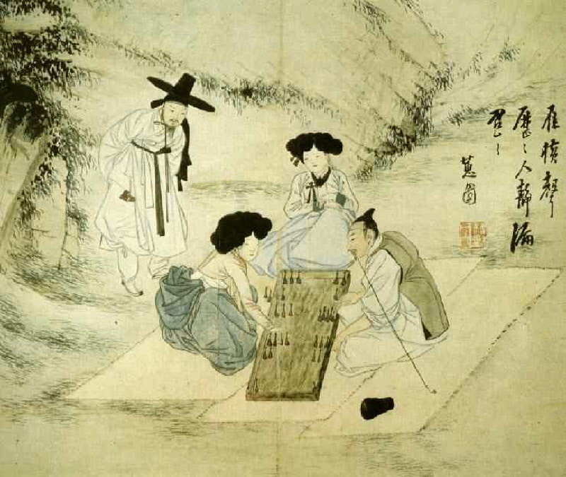 푸른색과 붉은 색의 말로 편을 갈랐다. 기생(야외에서 양반집 부녀자들이 거리낌없이 남자들과 마주앉아 놀이를 할 수 있었을까?) 쪽에만 푸른 말 두개가 나와 있는데, 판 위의 말은 모두 각 14개씩이다. 아마 붉은 색 말 두개는 남자에게 가려져 보이지 않나 보다. 내려온 말이 두 개씩 밖에 되지 않는 것을 보니 놀이는 이제 막 시작되었나보다. 그래도 초반의 기세가 어느 순간 승패를 가름할 수 있다는 것을 알리려는지 “기러기 비켜나는 울음소리 역력한데, 인적은 고요하고 물시계 소리만 아득하다.” 고 온 정신을 놀이에 쏟고 있는 모습을 오른쪽에 시로 써 놓았다.