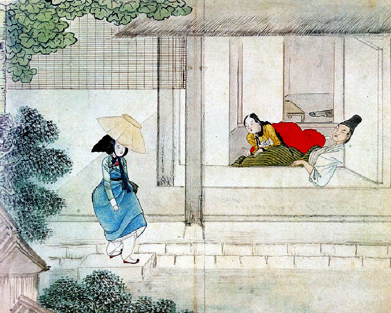 기생이 외출했다가 돌아오고 있는데 그 사이 왠 사내와 와 몸종이 방안에서 무슨 일을 벌이고 있었던 모양이다. 왼쪽 나무잎이 무성한걸 보니 계절은 더운 여름. 날이 더우니 기생도 전모를 썼을 것이다. 그런데 남자는 한여름에 이불을 덮고 있을까? 방안의 두 남녀는 이상한 짓(?)을 하다가 갑자기 주인기생이 찾아오자 누비이불을 덮은 것은 아닐까?