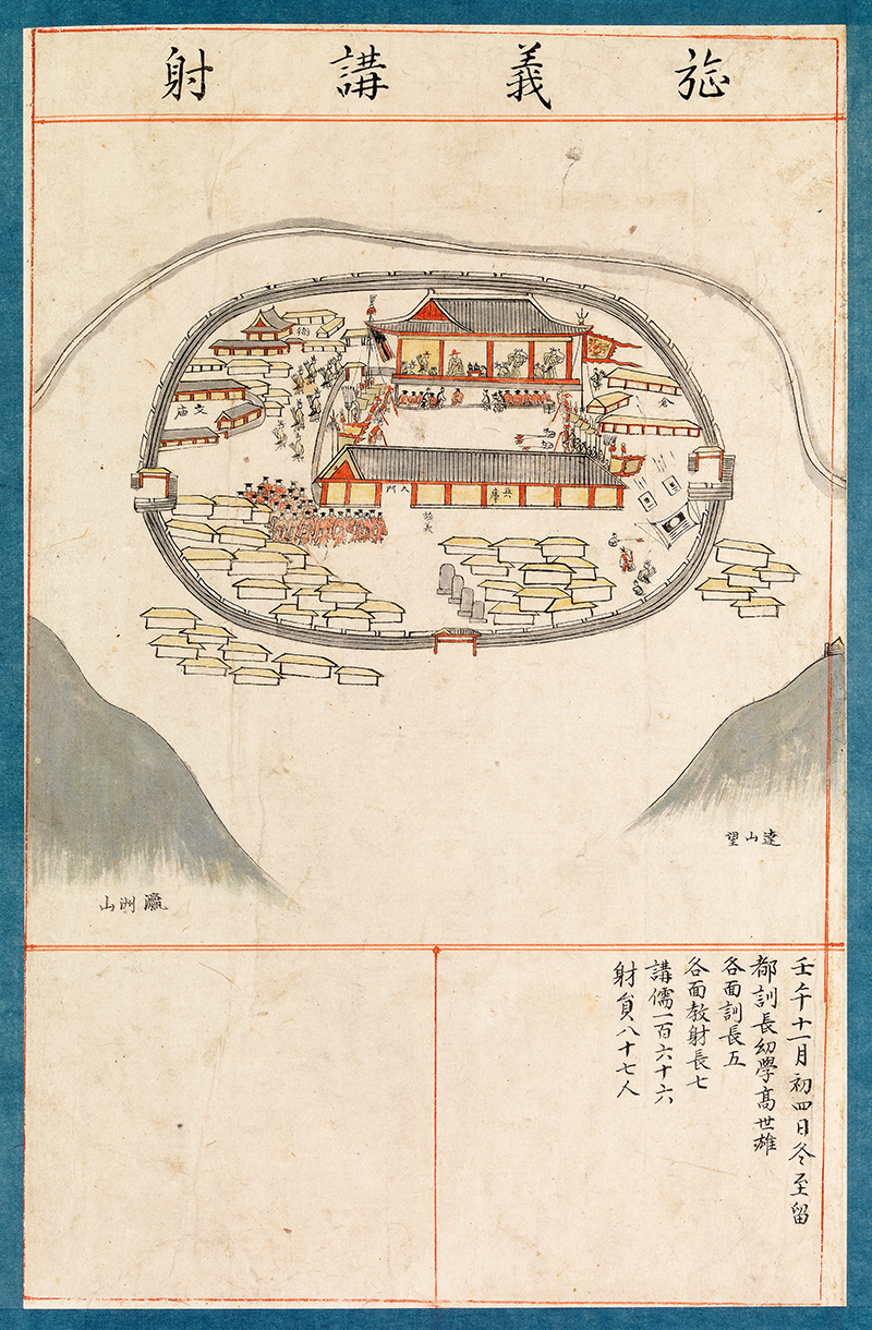 1702년(숙종 28) 11월4일 동짓날에 정의현에 머물면서 시행한 강사(講射), 즉 강(講)받기 시험과 활쏘기 시험 장면