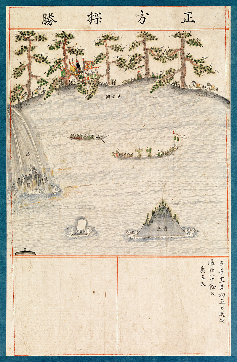 1702년(숙종 28) 11월5일 배를 타고 정방폭포를 탐승하는 모습을 그린 그림