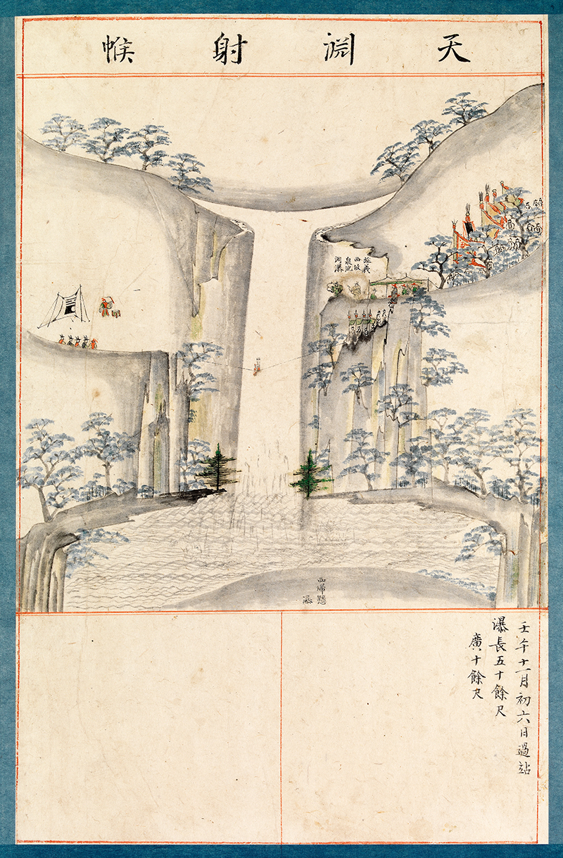 1702년(숙종 28) 11월6일 천지연폭포에서의 활을 쏘는 장면을 그린 그림
