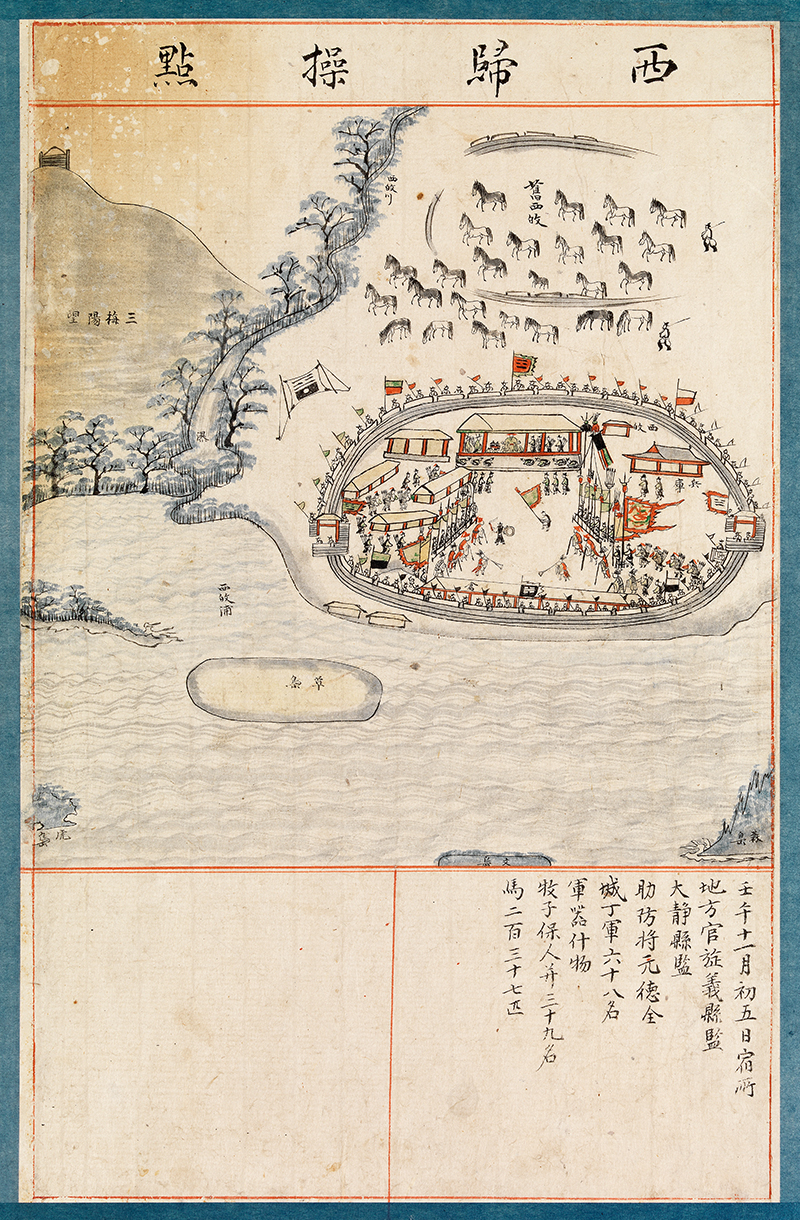 1702년(숙종 28) 11월5일 서귀진의 조련과 군기 및 말을 점검하는 그림