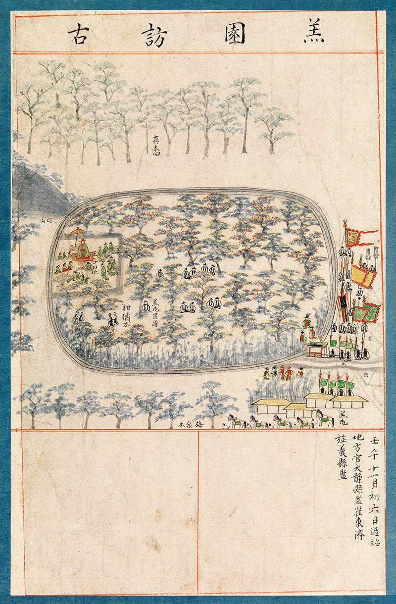 1702년(숙종 28) 11월6일 고둔과원(羔屯果園)에서 왕자구지(王子舊地)를 탐방하는 그림