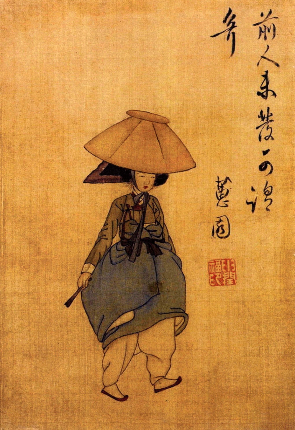 여속도첩에 나오는 그림 중 하나이다. 마치 걸어가고 있는 듯 생동감이 넘친다. 얼굴은 어려보이는데, 치마를 올려 속바지가 다 보이게 입고 있다. 치마를 오른쪽으로 두른 걸 보면 양반댁 규수는 아니다. 전모는 주로 낮은 신분의 사람들이 쓰던 우산 대용의 모자이다.